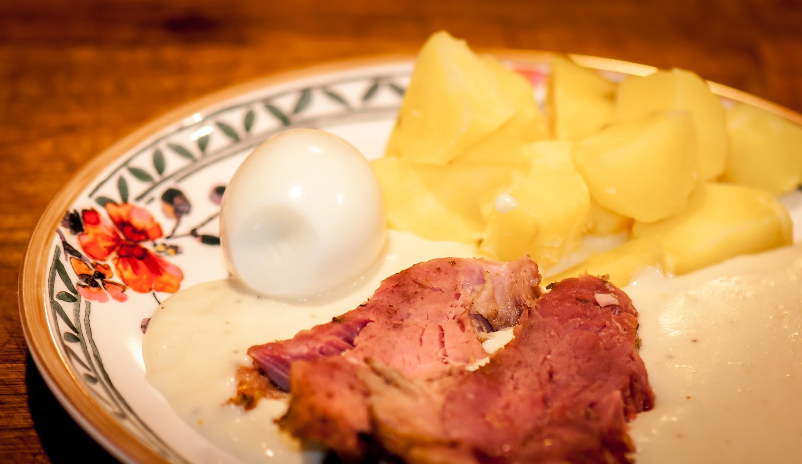 Klasická omáčka, kterou můžete dát jak v bezmasé variantě s vajíčkem tak s vařeným masem či uzeným. Může být s houskovým knedlíkem, já jsem tentokrát volila vařené brambory. (méně práce a dietnější verze)