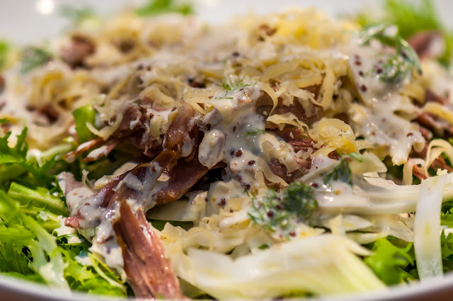 Postup je velmi jednoduchý, umyjte a osušte salát. Používám odstředivku na salát, považuji ji za jednoho z největších pomocníků v kuchyni, pokud děláte saláty a ještě ji nemáte, neváhejte. Fenykl nakrájejte na tenké proužky. Maso natrhejte na malé kousky. Na talíř dejte salát, posypte nakrájeným fenyklem a nandejte maso. Navrch nastrouhejte sýr a lžícemi křížem krážem pokapejte zálivkou, na kterou jste smíchali všechny ingredience. Pokud jste měli na fenyklu nějaké lístky, nakrájejte je do zálivky.