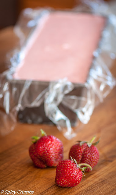 Jakou formu zvolíte je na vás, použila jsem hranatou formu na chlebíček, vyložila potravinovou folií, na dno jsem dala piškoty a nalila do ní jahodovou hmotu. Šlo by to udělat i obráceně, nejdřív hmotu, navrch piškoty. Dala jsem ztuhnout do lednice, asi po 2-3 hodinách jsem povrch přikryla také folií, aby dezert v lednici nechytal pachy. Před servírováním jsem pak jednoduše celou formu tak, jak byla v lednici přiklopila skleněným prkénkem a otočila, celý dezert se vyklopil, shrnula jsem folii a nakrájela, zbytek zase přikryla folií a poklopila formou a otočila i s prkénkem vzhůru nohama a vše zase uložila do lednice. Pokud použijete dortovou formu, je to jednodušší, jen krájíte po sundání obvodu. Pěna je pěkně tuhá, tak akorát, příjemně nakyslá, osvěžující. prostě jahodová.