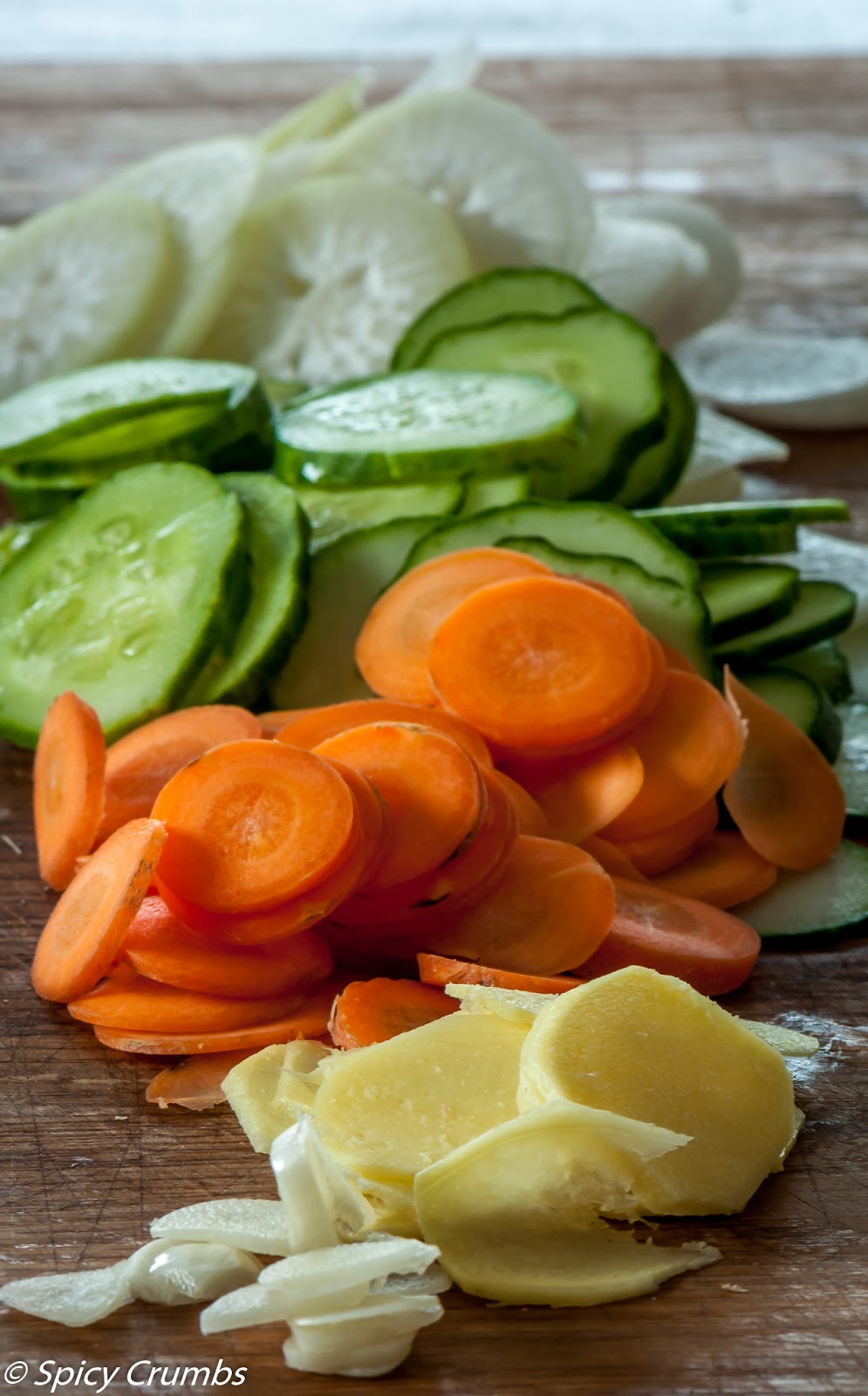 Ještě mi zbyla jedna vyvařená lahev, tak jsem si řekla, že ji musím naplnit. Nakrájela jsem na kolečka vyřazenou větší okurku, jednu mou bílou ředkvičku, která byla přiměřeně veliká, jednu mrkev, kousek zázvoru a česneku. Vše jsem v misce promíchala s ½ ČL kurkumy a 1 ČL kari a trochu kopru. Nacpala jsem to do sklenice, zalila lákem a sterilovala krátce v hrnci s vodou.