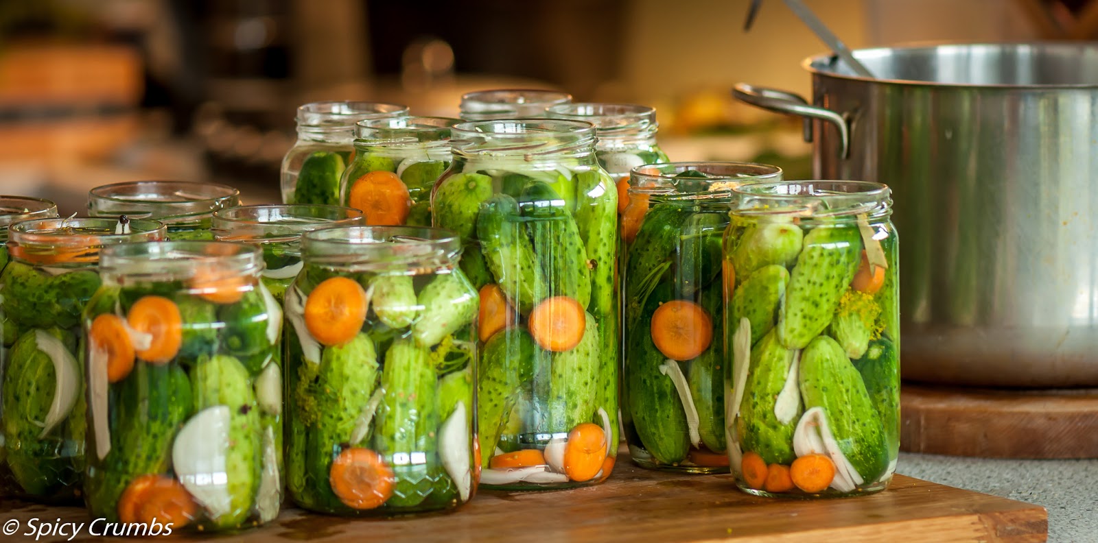 Pak nalijte lák, který už je teplý, ne vařící. Sklenice zavřete víčkem, zatím ne úplně napevno. Okurky jsem sterilovala v troubě na 90 °C, nechala jsem je tam asi 20 minut, bylo vidět, že bublinky putují nahoru. Pak jsem je vyndala a utáhla víčka. Nedávala jsem je dnem vzhůru. To možná příště udělám. Nedokázala jsem totiž u velkých víček na medových sklenicích poznat jistě, jestli se chytla, zdálo se mi, že mají dutý zvuk. Budu moc ráda, když mi napíšete nějaký tip, jak to děláte vy, co funguje. Já jsem nakonec jednu sklenici 2 den otevřela a podtlak tam byl, chytla se. Aspoň jsem mohla okurky ochutnat, jsou výborné, tak akorát chuťově a krásně křehké. Další ochutnávka po týdnu, stále dobrý 🙂
