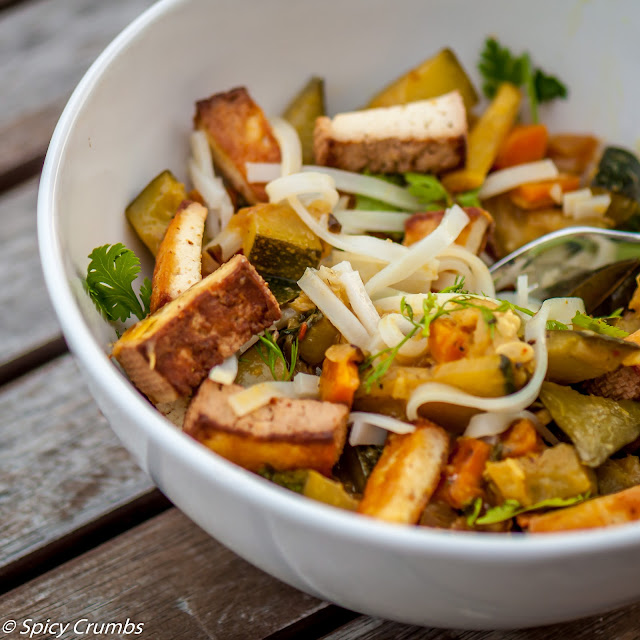 Podávejte s nudlemi nebo rýží, na kari nasypte tofu a koriandr.