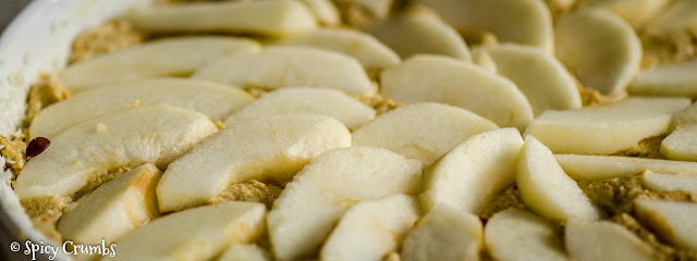 Těsto dejte lžící do vymazané formy a opatrně rozprostřete rukama. Navrch dejte jablíčka.