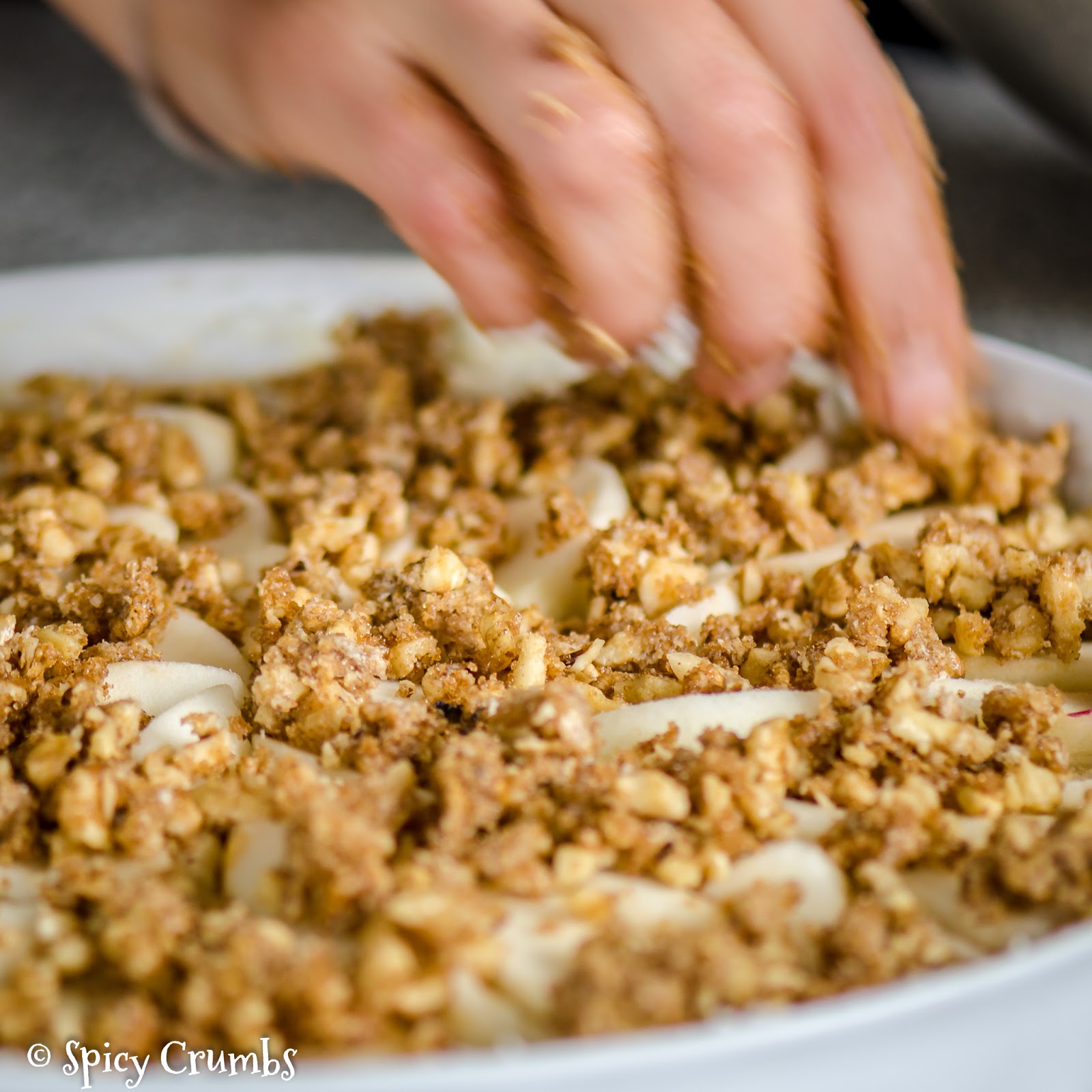 Posypte ořechovou drobenkou. Na tu smíchejte válečkem podrcené ořechy s máslem a hnědým cukrem.