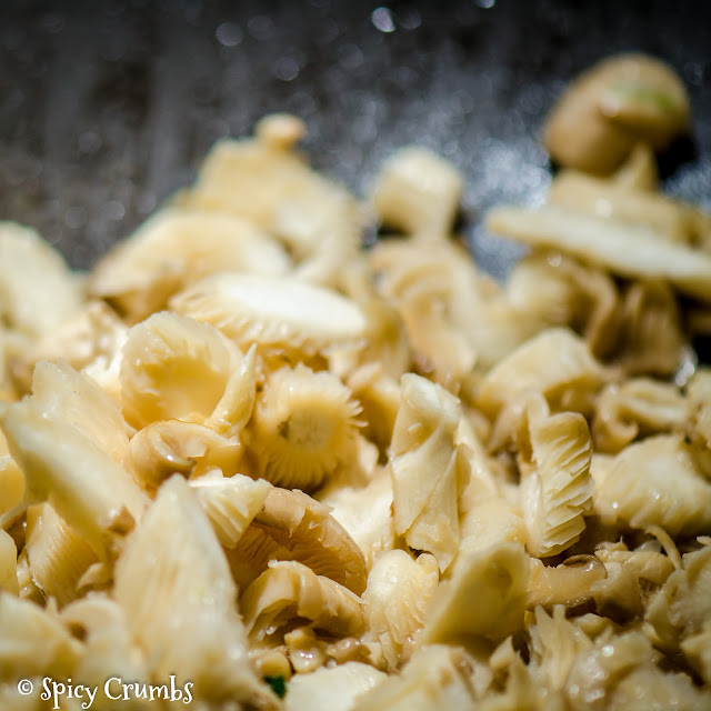 Do woku dejte 2 PL rostlinného oleje, rozpalte a krátce opečte olej, jakmile začnou okraje plátků lehce žloutnout, vhoďte nakrájenou hlívu a opékejte. Osolte a opepřete.