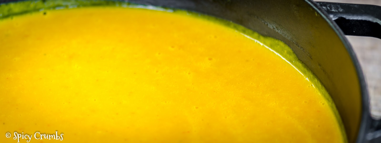 Do velkého hrnce dejte zesklovatět cibuli na olej. Přidejte pyré z dýně, bobkový list a zalijte vývarem, povařte asi 10 minut. Přilijte kokosové mléko, krátce povařte a osolte, opepřete podle chuti, záleží i na tom, jestli jste měli slaný vývar. Pak polévku odstavte a nechte mírně zchladnout. Vylovte bobkový list a rozmixujte na hladký krém buď v mixéru, nebo tyčovým mixérem v hrnci. Podle potřeby možná budete muset přilít vývar nebo vodu k dosažení požadované konzistence.