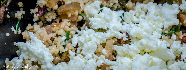Mezitím si připravte zálivku do kuskusu. Asi 4 PL olivového oleje smíchejte s 1 PL citrónové šťávy a 1 ČL Dijonské hořčice, mírně osolte a opepřete. Vymíchejte do hladké emulze. Do hrnce s kuskusem nadrobte sýr a zalijte zálivkou a promíchejte. Podle potřeby dosolte.