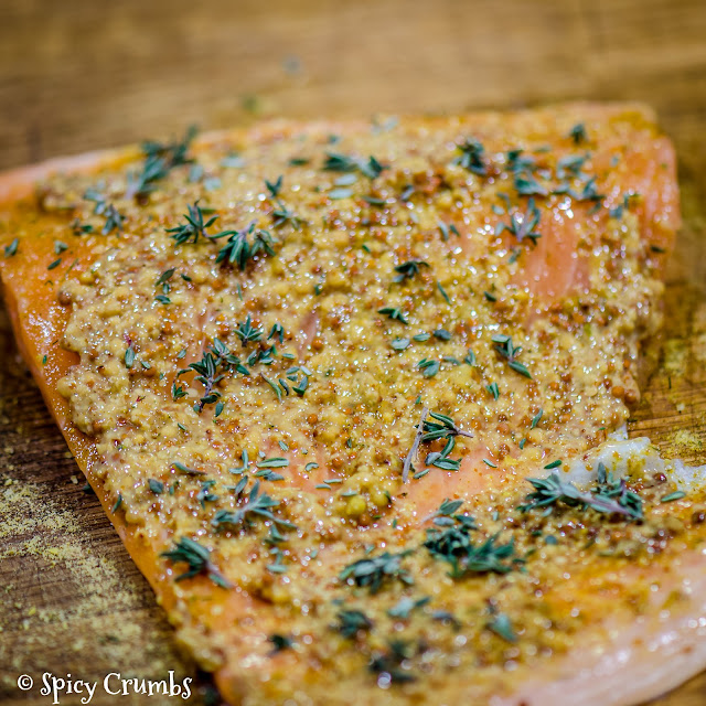 Rybu posypte kořením a potřete hrubou hořčicí a posypte tymiánem.