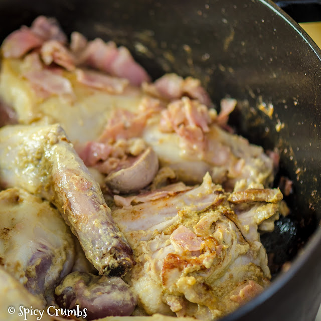 Moje mamka je výborná kuchařka a nikdy se nebála zkoušet nové věci a tenkrát tu opravdu nebylo snadné přijít k nějaké inspiraci. Tato kuchařka do naší rodiny “zapadla” a pár receptů jsme si doma oblíbili, 2 se staly stálou součástí našeho jídelníčku. Jedním je vynikající savojská mrkvovo – bramborová polévka, kterou tu určitě taky někdy představím a druhým jídlem je právě králík v hořčici, pečený na bílém víně – králík Braillon. Recept jsem si proti původnímu jen mírně upravila, přidala jsem k ingrediencím tymián a anglickou slaninu (už tedy nebude jen francouzský 🙂 a taky jsem upravila teplotu a dobu pečení. Příprava je na to, jak luxusní lahůdka to bude, velmi snadný.