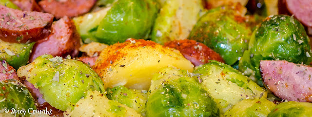Slijte vodu z kapustiček a propláchněte je studenou vodou a nakrájejte na půlky. Na velký plech dejte uvařené brambory a kapustu. Přidejte pokrájenou klobásu. Pak pokapejte lžící česnekem s olejem. Posypte jemně oreganem a paprikou. Proházejte, aby se směs rovnoměrně obalila olejem. Pokud je ho málo, ještě trochu pokapejte a proházejte. Mírně osolte a opepřete.