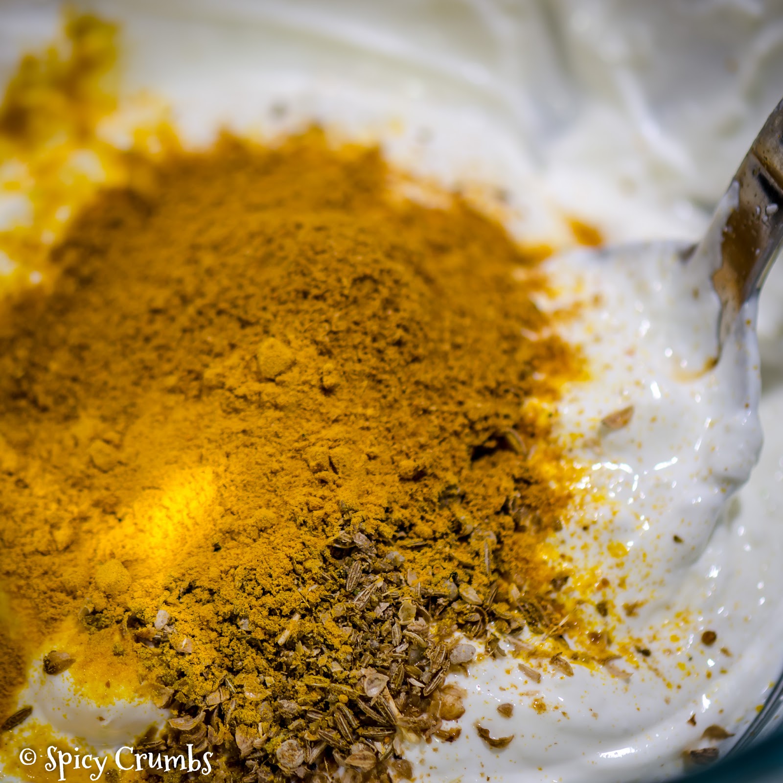 Nejdříve si připravte marinádu na maso smícháním jogurtu, strouhaného zázvoru a 2 stroužků česneku. Vmíchejte do jogurtu drcené koření, kurkumu a garam masalu.