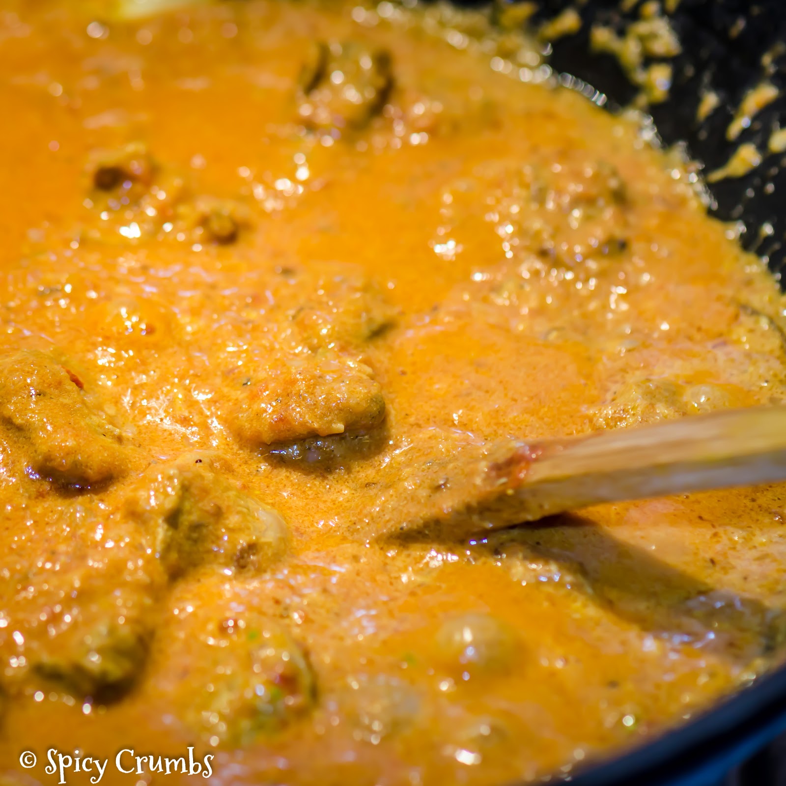 Pak po částech přidávejte marinované maso (ať se ghí nebo máslo moc neochladí) a opékejte. Vytřete z misky zbytek jogurtu do pánve. Pak přidejte rajčatovou kaši a duste otevřené na mírném ohni asi půl hodiny, omáčka zhoustne a vydusí se.