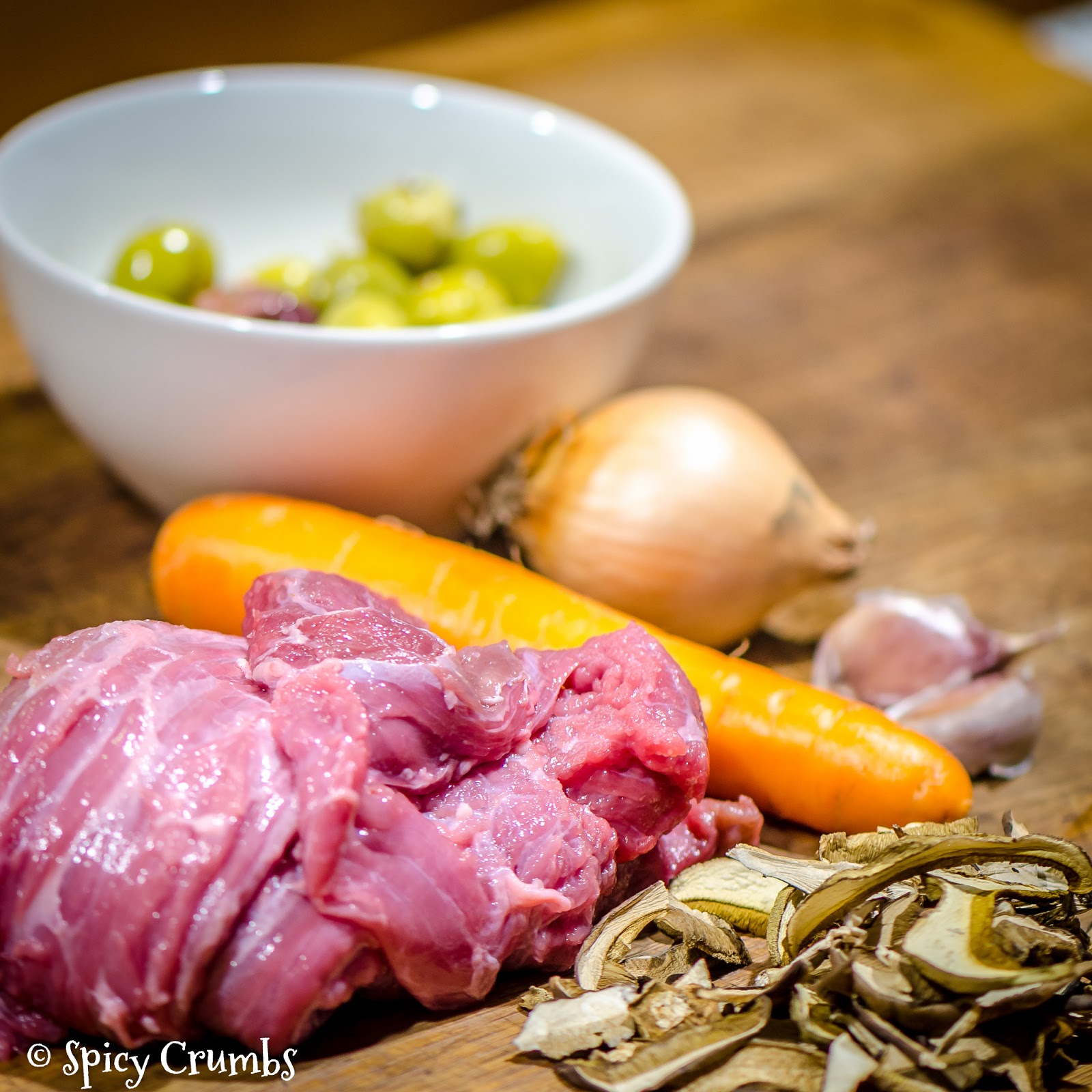Kousky osmahněte dorůžova na rozpáleném oleji buď na pánvi, ideálně v těžkém pekáči, kde budete pak péci. Pokud jej máte víc, tak pracujte po dávkách, ať se vám olej neochladí a maso nedusíte, pustilo by šťávu a to nechcete. Pak jej vyndejte a ve výpeku osmahněte zeleninu, vhoďte bylinky, vraťte maso, přidejte rajčata, olivy a houby, zalijte vínem a vývarem. Osolte, opepřete, doveďte k varu, přikryjte poklicí a dejte do trouby rozehřáté na 150 °C na 2 hodiny.