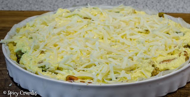 Na to lžící naložte tvarohovou vrstvu a posypte sýrem.