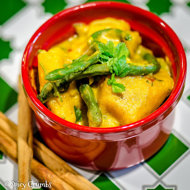 V hrnci rozehřejte ghí, osmahněte krátce nadrobno nakrájenou cibuli, česnek, zázvor a chilli papričku. Okořeňte curry směsí, kurkumou a skořicí s chilli kořením. Přidejte dýni oloupanou (podle druhu, Hokkaido nemusíte) a nakrájenou na větší kousky (asi jako vařené brambory), promíchejte a zalijte kokosovým mlékem a vývarem, osolte. Přidejte brambory nakrájené na ¼. Přiklopte poklicí, nechte ale malou škvírku a vařte na mírném ohni.
