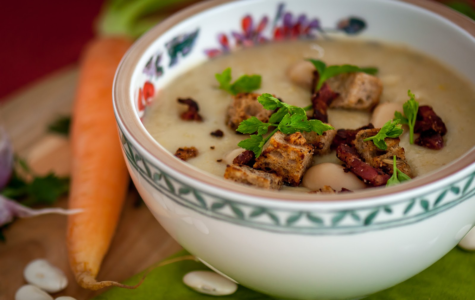 Zeleninu a cibuli nakrájejte na malé kousky a osmahněte na másle, zaprašte hladkou moukou a opečte dozlatova. Zalijte vývarem případně vodou a použijte nějaký dobrý instantní bujon. Vhoďte fazole a vařte, až bude zelenina měkká. Pár fazolí si nechte, ať máte v polévce co kousat :-). Pak rozmixujte tyčovým mixérem. Můžete vše ještě přecedit, zbavíte se tak hrubších kousků slupek fazolí a polévka bude krásně jemná. Dochuťte česnekem, osolte, opepřete dle chuti.