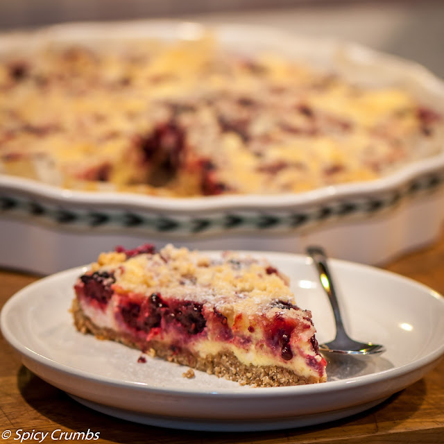 Tento koláč je celkem univerzální. Ovoce můžete různě obměňovat podle toho, co zrovna máte po ruce. Já jsem použila ostružiny mražené a koláč byl vynikající. Díky náplni z ricotty, která je sladká, je vhodné i kyselé ovoce.