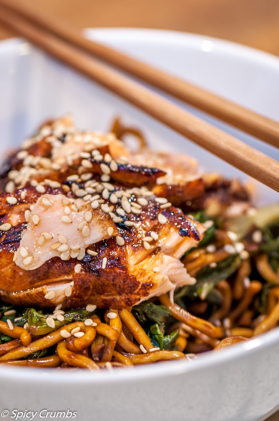 Z medu, sójovky a octa smíchejte marinádu, do které dáte lososa. Nechte marinovat aspoň 2 – 3 hodiny nebo klidně přes noc. Uvařte nudle nebo rýži. Pak vyndejte rybu z marinády, tu nevyhazujte, budete ji potřebovat. Opečte na pánvi, jak máte rádi, úplně nebo do růžova, zkrátka jak chcete mít rybu udělanou. Do woku dejte asi 2 PL oleje, osmahněte zázvor a česnek, přidejte zeleninu a opékejte. Nalijte do pánve marinádu a krátce povařte. Vhoďte nudle, promíchejte. Pokud budete podávat s rýží, tu dejte rovnou do misek, směs z pánve s rybou dáte pak na bílou rýži. Dejte promíchané nudle do misek, navrch dejte natrhané kousky lososa, posypte sezamovým semínkem.
