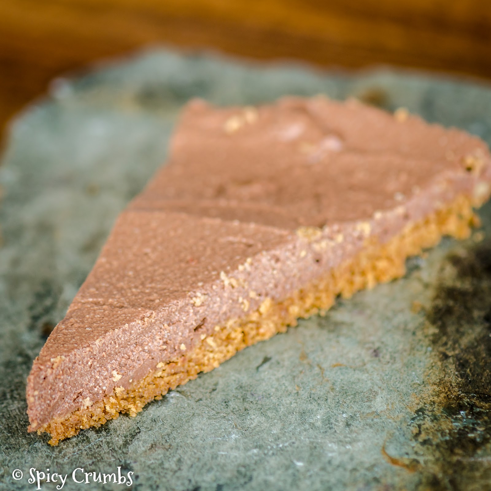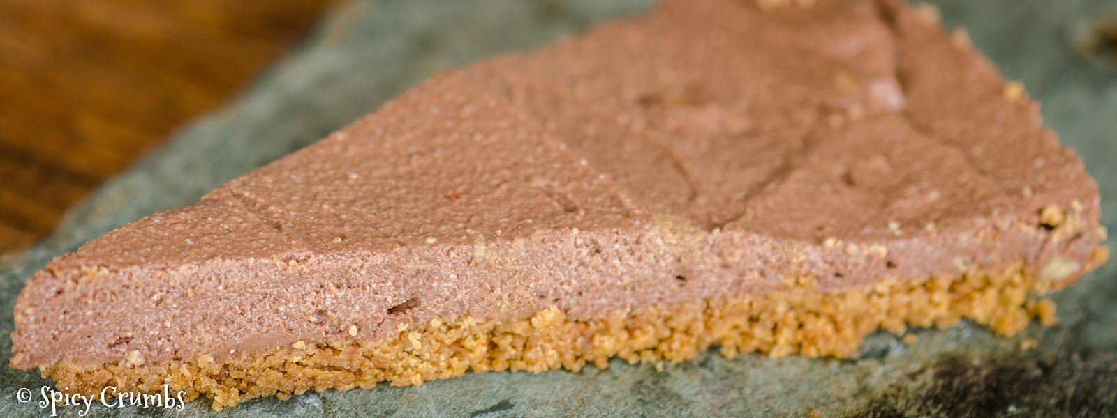 V receptech, co jsem našla, byl čokoládový krém podávaný samostatně. Ale já jsem při výrobě měla pocit, že tomu něco chybí. S tofu byl krém opravdu lehoučký, jemný, ale na můj vkus bych od čokoládového krému čekala trochu hutnější konzistenci. Bylo to na mě až moc lehké, krém působil tak nějak moc “zdravě” :-). Tenhle problém jsem nakonec vyřešila tak, že jsme se rozhodla jej použít na cheesecake bez pečení. Vyrobila jsem korpus z drcených sušenek Speculatius, což byla výborná volba. Vznikl vynikající dortík a s klidným svědomím vám můžu doporučit jej vyzkoušet. Je velmi žádoucí nechat dort přes noc provlhnout v lednici, protože korpus byl jen z drcených sušenek a rostlinného oleje, tak aby se dal natlačit do formy. Při první večerní ochutnávce se trochu drobil, ale nevadilo to, co se nadrobilo, mohlo se nasypat na povrch dílku jako ozdoba. Druhý den po odležení už spontánně drobky nepadaly, porce se lopatkou krásně dala přenést na talíř.